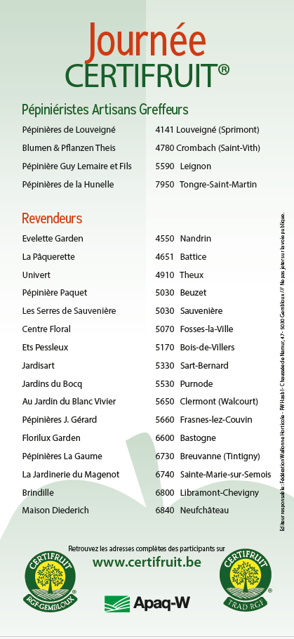 La brochure, éditée par le CRA-W et la FWH en partenariat avec le Collège des Producteurs et le soutien de la Wallonie est en vente chez les pépiniéristes ‘Artisans Greffeurs’ et les revendeurs CERTIFRUIT.