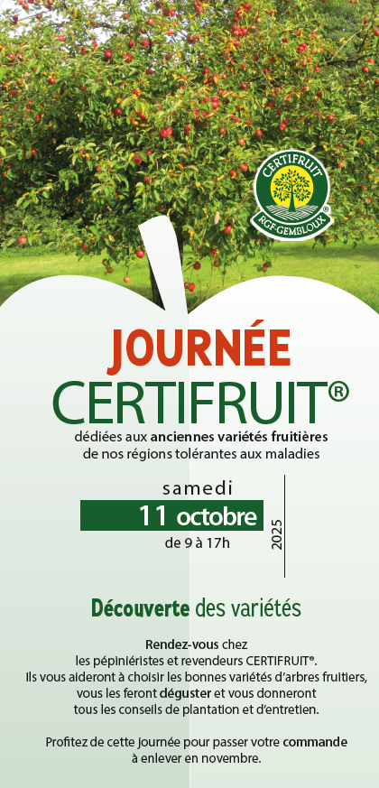 1. Le samedi 5 octobre 2024, ce sera une journée où les pépiniéristes et revendeurs qui ont signé la charte CERTIFRUIT seront disponibles pour vous donner toutes les informations sur les anciennes variétés d’arbres fruitiers :  Quelle variété choisir ? Quelle est la taille idéale de l’arbre pour mon jardin ? Comment bien planter ?…  Ils partageront leurs connaissances et tout ce que vous devez savoir pour choisir, planter et entretenir un arbre fruitier. Ce jour-là, il sera aussi possible de passer commande.